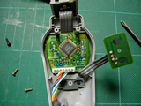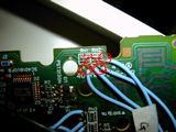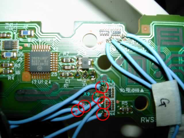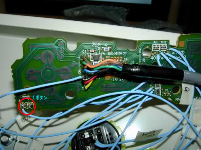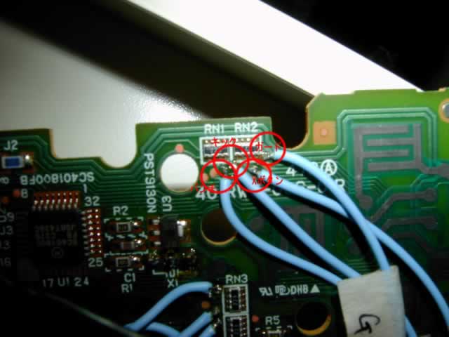 プレステ1のコントローラ全体です。 左下の赤丸 が「L1」ボタン。三つ並んだ まんなかは コモン端 子です。