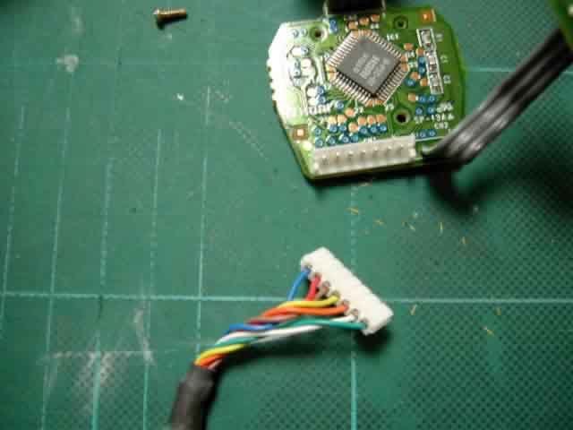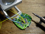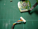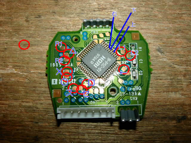 仕方が無いので、ホリパッド2のIC(同じ)を 参考に足から直接、線を出しました。 しんどかったぁ。 コレは、皆さんに勧められま せん! そばにあるのはコテ先を細く削ったコ テと確認用のルーペ。ふぅ。